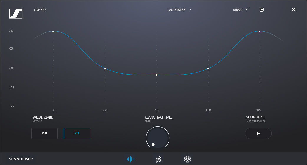 Ansonsten kann man hier noch zwischen 2.0 und 7.1 Sound umschalten, die Klangkurve anpassen oder man benutzt eines von 4 vorgefertigten Profilen: Esport (treble), Flat, Movie, Music. Das Esport Profil ist in meinen Augen nur geeignet, wenn man das Headset für die Kommunikation nutzt (durch den Fokus auf hohe Frequenzen), ansonsten hat mir persönlich das Music Profil am besten gefallen, wenn man das Headset auch zum normalen Zocken im Singleplayer oder zum Netflix gucken nutzen will. Auch das Mikrofon kann man hier tunen mit Stimmverstärker, Pegeleinstellungen und Geräuschunterdrückung. Im Praxistest empfand ich die Klangqualität etwas blechern und definitiv nicht auf dem gleichen, hohen, Niveau der Kopfhörer.