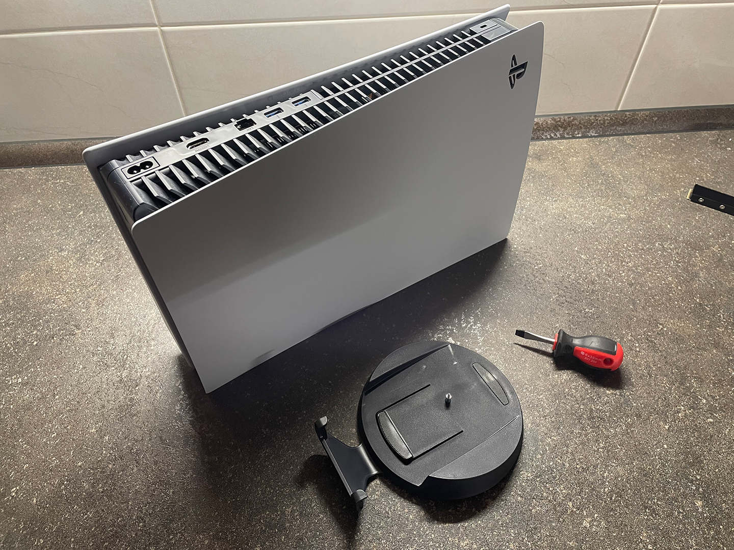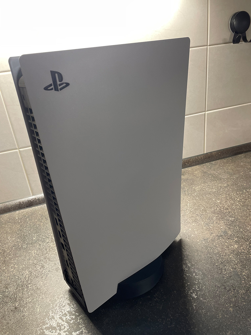 Zuerst muss der Standfuß ab, danach die PS5 auf die Seite legen - das PS5 Logo zeigt nach unten