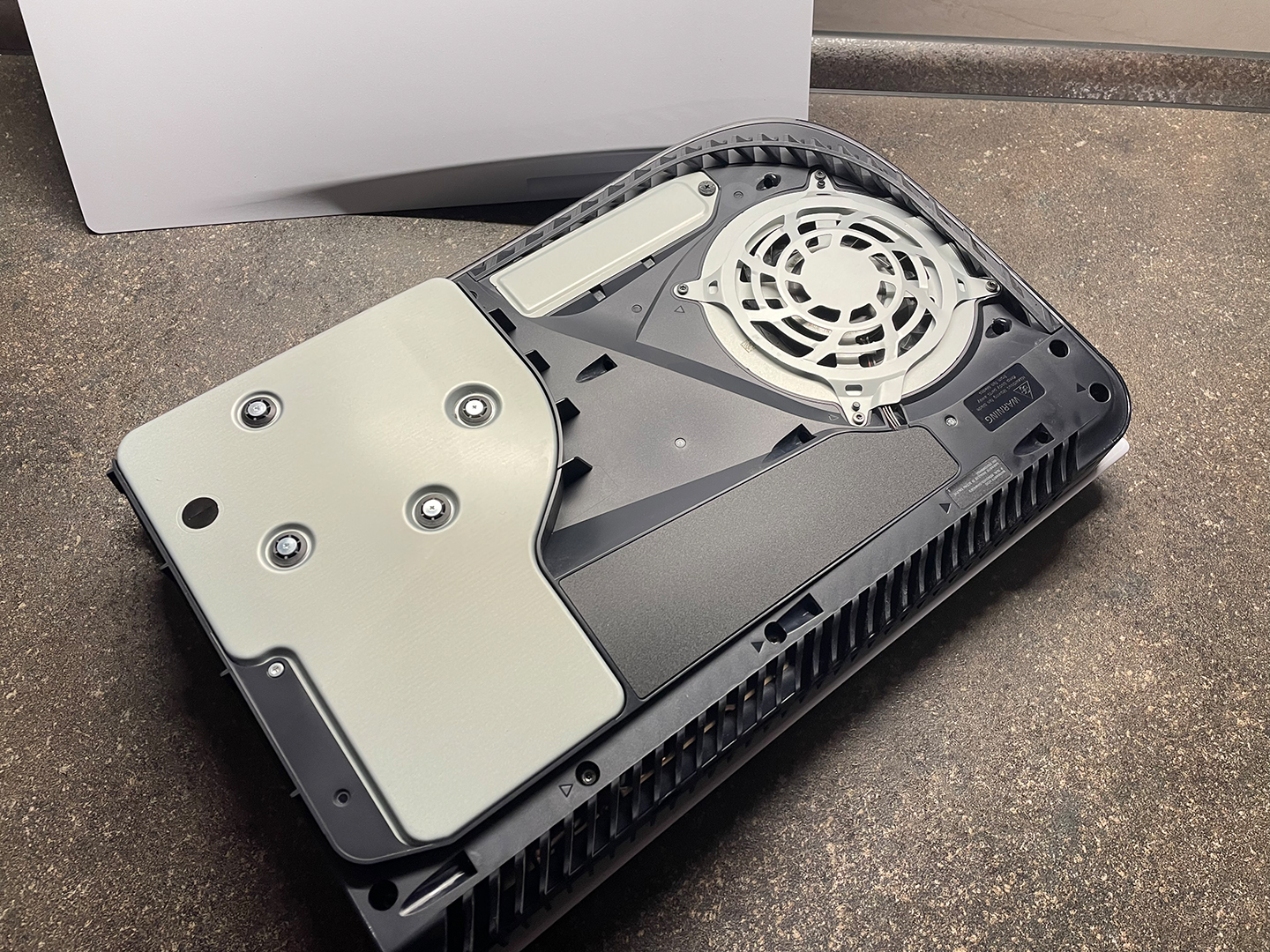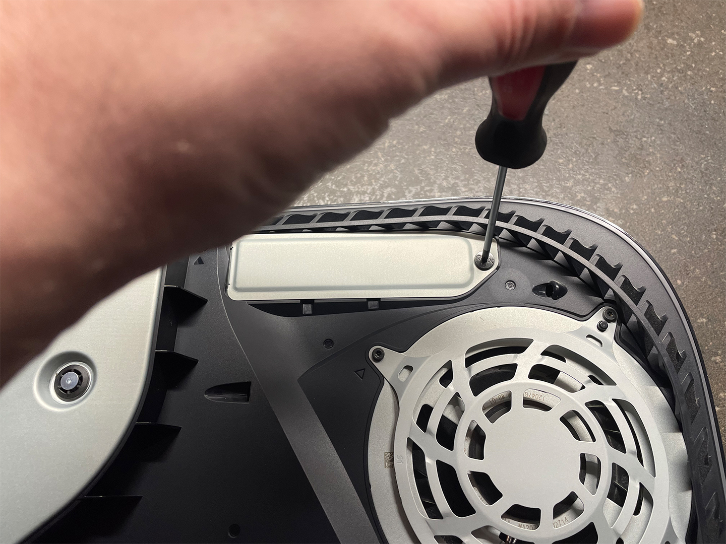 Nun wird die Abdeckung wieder draufgeschraubt und die Faceplate der PS5 wieder auf die Konsole draufgeklickt.