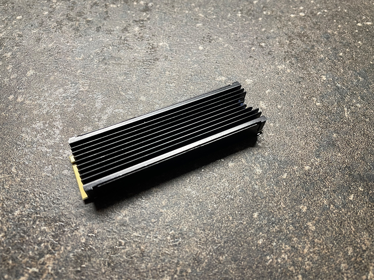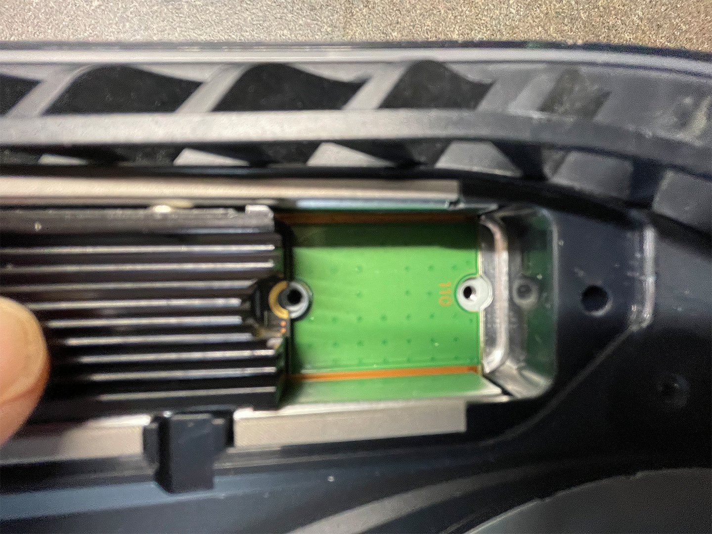Die SSD wird vorsichtig mit den Kontakten in die Halterung eingeführt. Die halbrunde Aussparung sollte dann passgenau mit einem Loch (hier das letzte) übereinstimmen - Ansonsten muss der Kühlkörper nochmal nachjustiert werden.