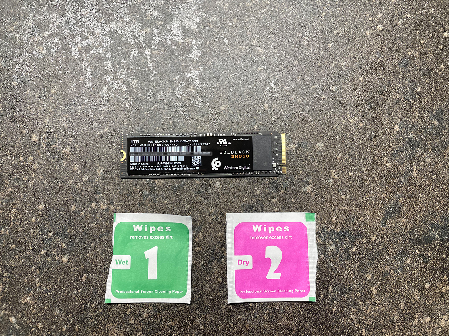 Als erstes werden die beiden Seiten der SSD abgewischt - zu erst mit einem feuchten Tuch, dann mit einem Trockenen - der Typenaufkleber kann draufbleiben