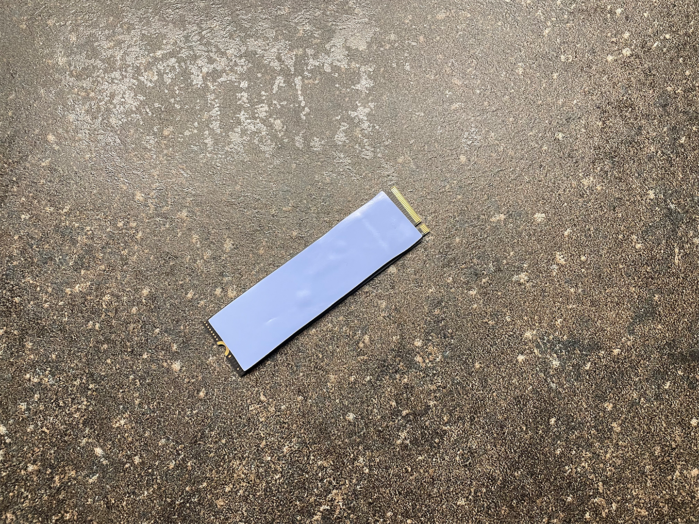 Als nächstes wird das 0,5 mm starke Silikonkissen (rosa) auf die Alu-Unterseite der SSD aufgebracht - wichtig: nicht auf die goldenen Sachen kleben; die halbrunde Öffnung wird für die Befestigungsschraube in der PS5 gebraucht