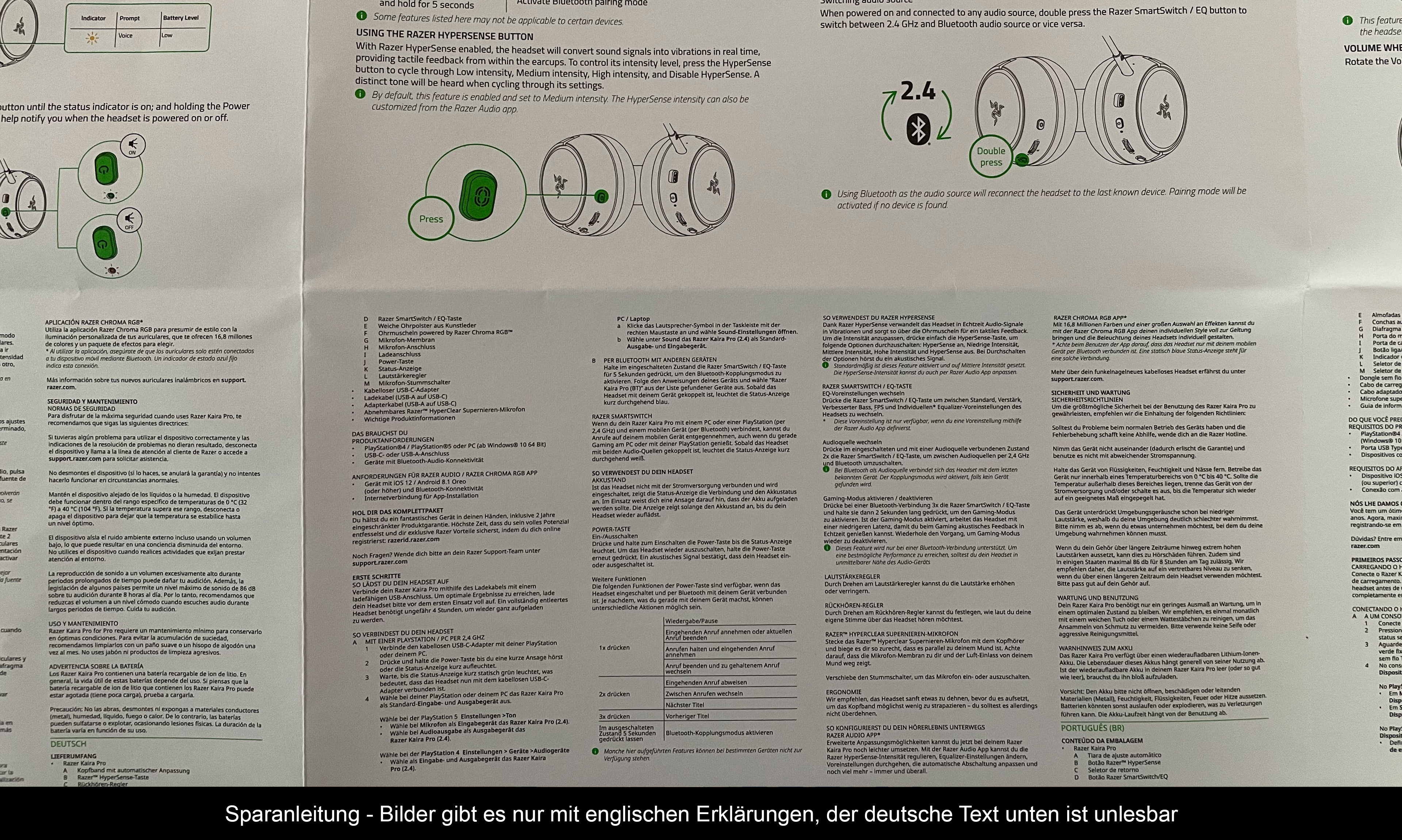 Noch ein Wort zur Bedienungsanleitung. Diese ist definitiv verbesserungswürdig. Es werden zwar ein paar Bilder geboten, aber nur mit englischen Anweisungen, die deutsche Übersetzung kommt ohne Bilder aus und wurde mit so einer winzigen Schriftgröße abgedruckt, dass diese schlichtweg unlesbar ist.