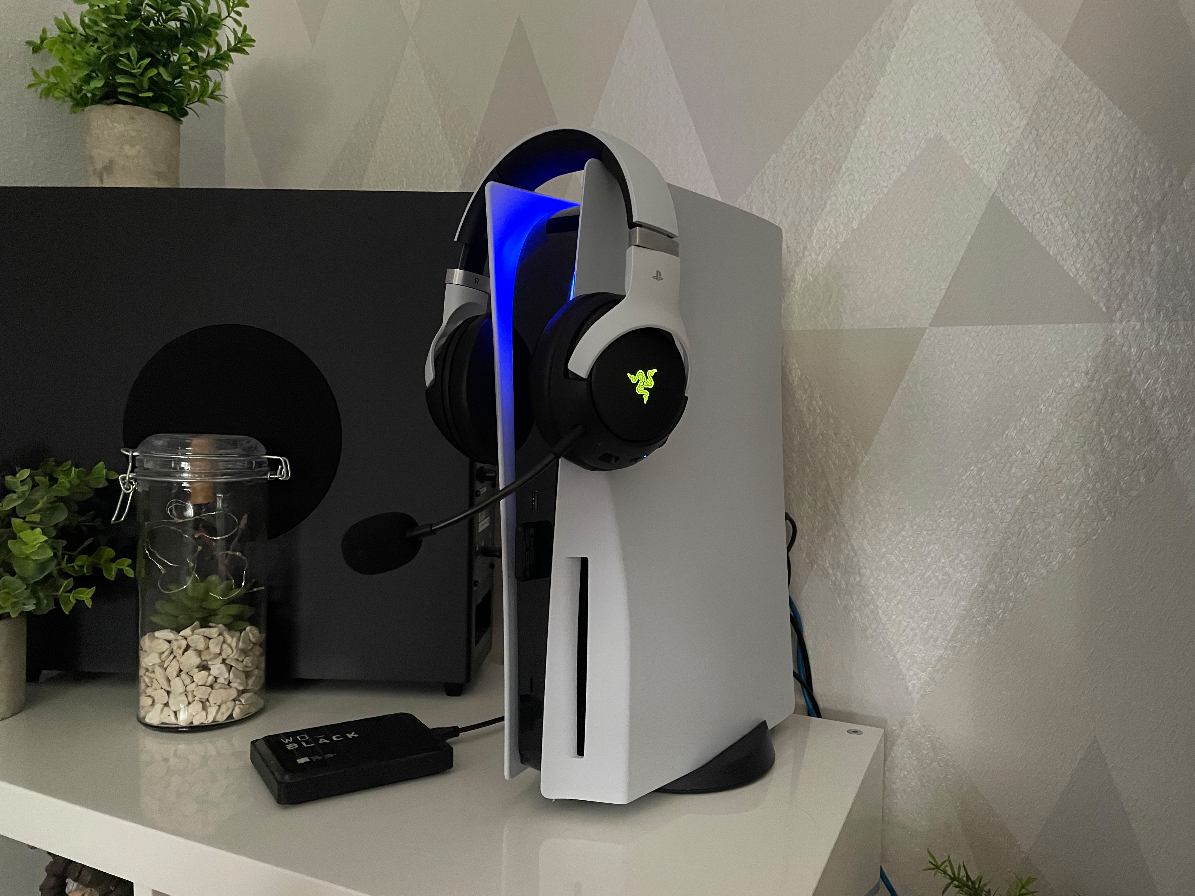 Optisch passt das Kaira Pro Hyperspeed perfekt zur PS5. Sowohl die Farbgebung als auch das schlanke Design spiegeln nahezu identisch die Design-Philosophie der Konsole wieder. Neben einem riesigen aber trotzdem unauffälligen Razer Schriftzug auf dem Bügel machen vor allem die Logos auf den Ohrmuscheln etwas her. Diese wechseln im Betrieb die Farbe. Razer nutzt das so genannte Chroma RGB Feature auch in anderen Geräten. Optisch macht das schon was her, wobei man selbst jedoch nichts davon sieht (wenn man das Headset aufhat). Die Passform ist identisch mit dem Kaira Pro – sprich die Ohrmuscheln fallen recht rund aus und sitzen nicht ganz perfekt auf den Ohren.