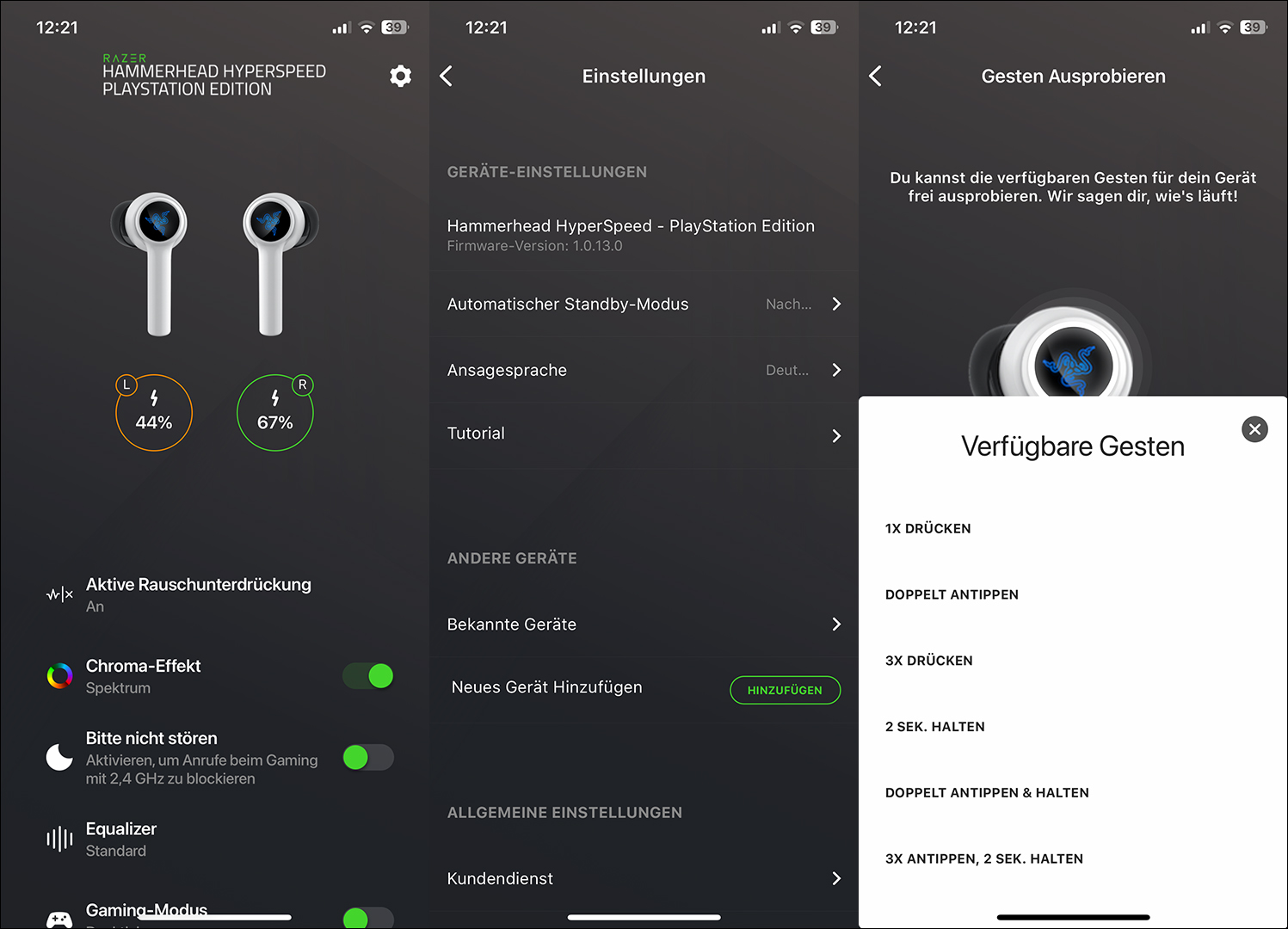 Klappt man das Case auf, aktivieren sich die Earbuds, klappt man es zu, gehen sie aus. Ebenfalls gehen sie automatisch aus, wenn über eine bestimmte Zeit keine Verbindung zu einem gekoppelten Gerät besteht. Die eigentlichen Ohrstöpsel orientieren sich am Design der Apple Air Pods – sprich es gibt einen handlichen Stiel, durch die man die Geräte problemlos in die Ohren und natürlich wieder rausbekommt. Ich hatte vor einiger Zeit die Epos GT270 Earbuds getestet und da war die ganze Handhabung wesentlich fummeliger. An jeweils einer Seite befindet sich das typische Razer-Logo, welches dank Chroma RGB farblich an den eigenen Geschmack angepasst werden kann. Dazu braucht man allerdings die Razer App. Hier kann man neben dem Chroma-Effekt auch noch eine „Bitte nicht Stören“ Option aktivieren, sowie im Equalizer herumspielen und die aktive Rauschunterdrückung (ANC) dazu schalten. Ebenfalls sieht man den Akkustand der Earbuds und es lässt sich eine optionale dt. Sprachausgabe als Ansagesprache auf die Stöpsel herunterladen. Zudem gibt es ein Gesten Tutorial bzw. die Möglichkeit der Neubelegung der Aktionen.