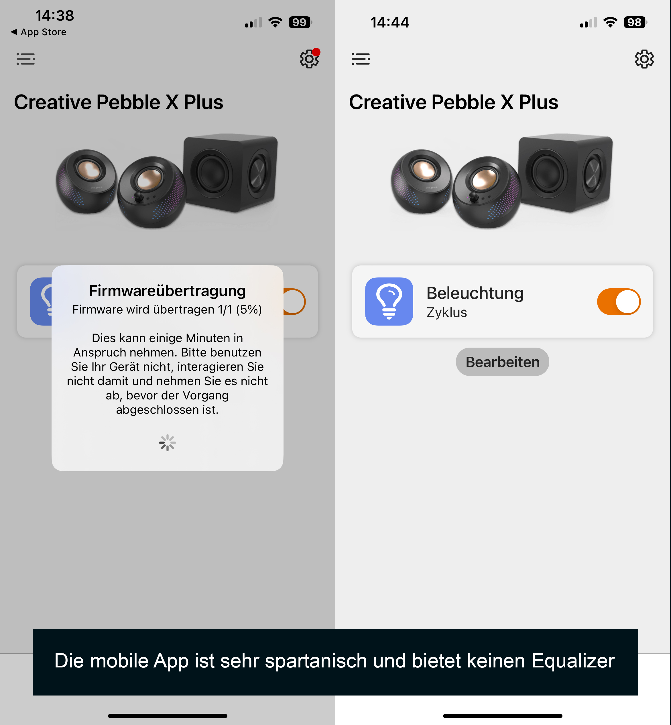 Creative bietet eine optionale App für mobile Android und IOS Geräte. Damit lassen sich die Licht-Effekte steuern und Firmware-Updates durchführen. Die Verbindung mit einem iPhone hat auf Anhieb geklappt und es traten ebenfalls keine Probleme beim Einspielen des Updates auf. Die Lautstärke lässt sich übrigens nicht mit der App regeln und auch weitere Features wie einen Equalizer oder Ton-Einstellungen allgemein sucht man vergebens. Das soll man wiederum mit einer PC App bewerkstelligen, die sich aber auf der Creative Website nicht herunterladen ließ (es kam jedes Mal eine Fehlermeldung). Davon abgesehen, wäre das sowieso nur eine Option, wenn man die Lautsprecher tatsächlich am PC betreiben will.
