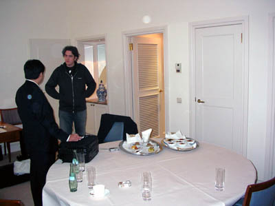 Nach unserem kurzen (20 Minuten und da haben wir schon überzogen) Gespräch mit Herrn Minagawa, wurden wir noch von der (weiter hinten sitzenden) Square Enix UK Belegschaft (alles Japaner) verabschiedet und bekamen einen Goodiebag (Final Fantasy XII Poster, Final Fantasy XII limitierte 4 CD Soundtrack Box und Final Fantasy XI Xbox360 Spiel) überreicht (Yeah!). Als kleine Anmerkung sei erlaubt, dass bei der Square Enix Gefolgschaft zwei außerordentlich hübsche Frauen dabei waren, die eher an japanische Hochglanzpopstars erinnerten, als an typische Businessladys. Hier fehlte Kollege Shagy, der sich sicherlich keinen Ast gemacht hätte und die beiden Mädels für unser Fotoalbum aufgenommen hätte. Als nächstes stand erstmal eine kleine Malzeiten mit teuren Appetithäppchen an und danach das ausführliche Anspielen des Rollenspiels.