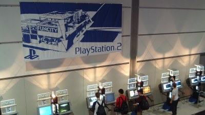 Der Stand von Sony Computer Entertainment Deutschland strotzte nur so vor Einfallsreichtum. Man hatte eine ganze Stadt (Die Stadt die es nicht gibt – Die fantastischen Vier) zu einem Zockerparadies umgebaut. So konnte man in der Straßenbahn Jak 3 und WRC4 (vernetzt) zocken, auf der Straße standen mehrere Gran Turismo 4 Kabinen, in der Bar wurde mit Crisis Zone scharf geschossen und in der zweiten Etage konnte man in den Studios Singstar und das neue DJ Spiel antesten. Doch damit nicht genug, man bot zusätzlich noch eine ganze Reihe an Spielstationen die an der Hallenwand stand. So kam man so oder so in den Genuss eines Spieles. Erwachsene Zocker konnten es sich auf dem Balkon bei einer gemütlichen Runde Killzone bequem machen, während alle anderen bei den stündlichen Singstar Wettbewerben oder beim hydraulischen Audi TT mit Gran Turismo 4 anstanden. Schön wurde auch das Chat Programm EyeToy: Chat präsentiert, in jeweils einem abgeschnittenen Raum musste der Spieler etwas auf eine Glaswand malen und der jeweils andere musste es dann erraten. Als Belohnung gab es ein schönes Schlüsselband.