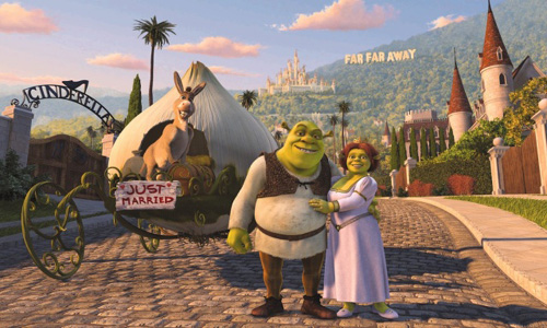 Shrek 2 setzt dort an, wo Teil 1 aufgehört hat und geht den Weg konsequent weiter. Nachdem im Vorgänger hauptsächlich Katzenberg’s Erzfeind Disney dran glauben musste, muss nun alles dran glauben was auch nur entfernt etwas mit Filmen zu tun hat. Das merkt man schon alleine in der Eingangssequenz, wo Fiona und Shrek in den Flitterwochen sind. Dort wird innerhalb von ein paar Minuten alles was man kennt durch den Kakao gezogen, sei es Herr der Ringe oder Arielle die Meerjungfrau. Andere machen einen ganzen Film draus, was Shrek 2 in 5 Minuten verbrät. Der Zuschauer kommt danach auch gar nicht erst zur Ruhe. Es geht Schlag auf Schlag weiter und beim ersten Sehen bekommt man nicht einmal alles mit. In jeder noch so kurzen Sequenz wird irgendwer oder irgendwas verarscht. Sei es Weit Weit Weg, welches gekonnt Hollywood auf die Schippe nimmt und wo Märchenstars in riesigen Villen residieren und bei Versacery oder Armani Armoury einkaufen. Auch die ein oder andere Ferrarikutsche fährt umher. Oder wo sonst sieht man einen Marlon Brando Verschnitt hinter der Bar, der dem kopflosen Reiter aus Sleepy Hollow ein Bier einschenkt, während Cpt. Hook am Klavier ein Ständchen gibt?