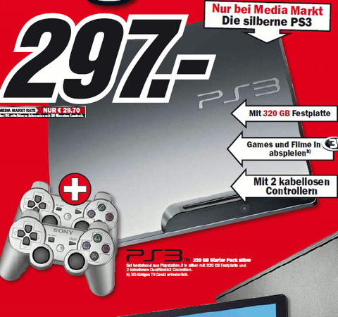 Nach Gamestop (weisse PS3) bietet auch der Media Markt eine Farbvariante exklusiv an. Die silberne PS3 Slim wird es als 320GB HDD Modell mit 2 Dualshock 3 Controllern für 297€ geben - einfach mal im aktuellen Prospekt nachschauen.