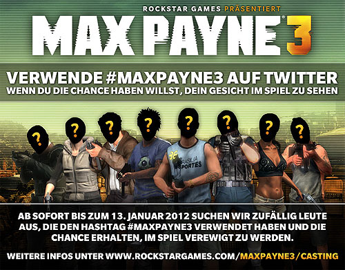 Wer ab sofort bis zum 13. Januar 2012 den Hashtag #MAXPAYNE3 auf Twitter verwendet, hat die einmalige Chance, dass sein Aussehen als Multiplayer-Charakter in Max Payne 3 verewigt wird.
