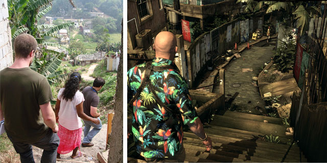 (Links: Entwickler von Rockstar besuchen die Favelas von São Paulo auf der Suche nach Inspirationen für das Leveldesign; Rechts: Max Payne taucht in die neu erschaffene Welt des Spiels ein.)
