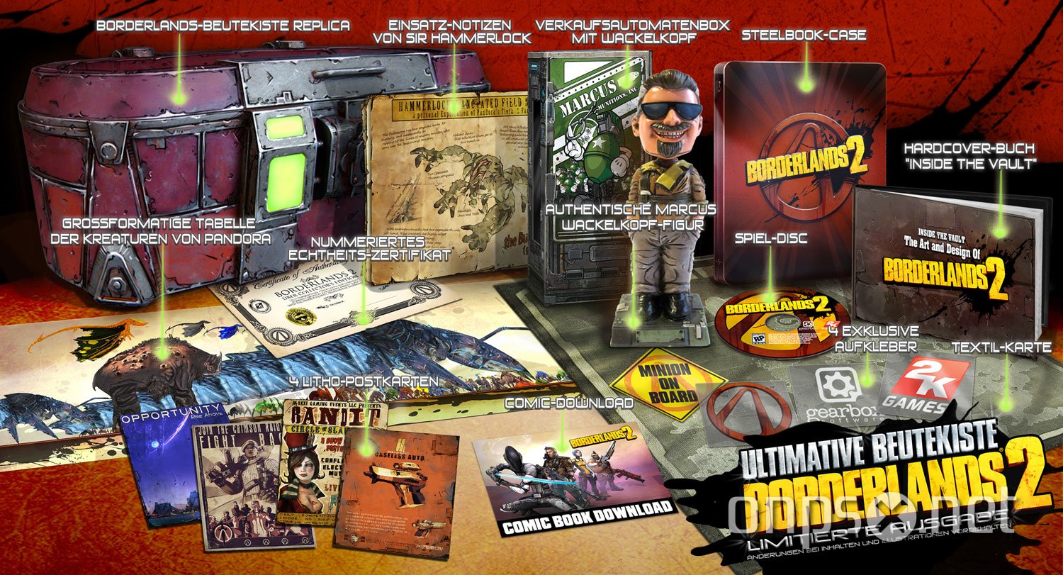 Die Deluxe Kammerjäger (Sammlerausgabe) enthält eine Version von Borderlands 2, einen authentischen Marcus Kincaid-Wackelkopf, eine Hardcover-Ausgabe von Inside the Vault: The Art & Design of Borderlands 2, einen Satz Sammelsticker, eine Karte von Pandora, einen Download-Code für einen digitalen Comic und digitale Bonus-Spielinhalte zum Herunterladen. Die Ultimative Beutekiste (Limitierte Ausgabe) enthält alle oben genannten Gegenstände und dazu noch eine maßstabsgetreue Replik der roten Truhen, die man in Borderlands 2 in ganz Pandora finden kann, eine Steelbook-Hülle, eine Übersicht über alle Kreaturen in Pandora im Großformat, einen Satz lithographischer Postkarten, Feldnotizen von Sir Hammerlock, eine Stoffkarte von Pandora und ein nummeriertes Echtheitszertifikat. Beide Spezialeditionen erscheinen für das Xbox 360 Videospiel- und Entertainment-System von Microsoft, das PlayStation 3 Computer-Entertainment-System und Windows-PC. Die Preise liegen je Plattform zwischen 70 Euro und 90 Euro für die Deluxe Kammerjäger Sammlerausgabe sowie 110 Euro und 130 Euro für die limitierte Ultimative Beutekiste.