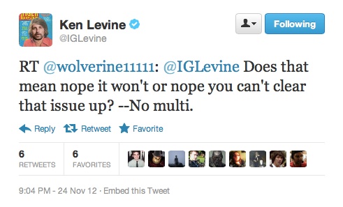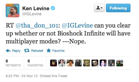 In letzter Zeit ist es bekanntlich serh ruhig um das neue "Bioshock" Spiel geworden. Nachdem man munkelte, dass der Titel mit einigen Problemen zu kämpfen hat und dadurch der Releasetermin auf das nächste Jahr rutschte, gibt der Chefdenker hinter dem Spiel,Ken Levine, nun per Twitter bekannt, dass Bioshock Infinite über keine Multiplayermodi verfügen wird.