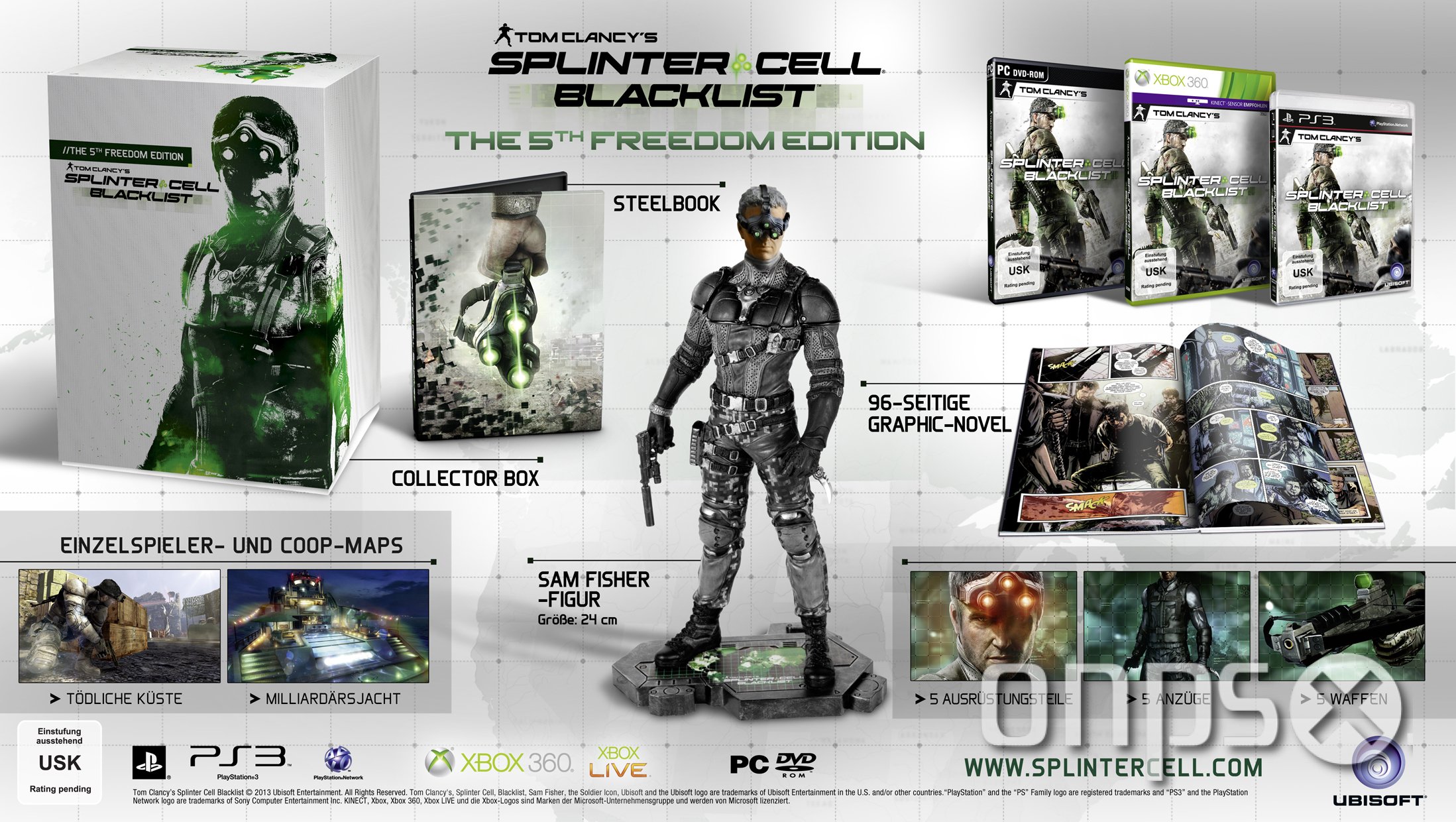 Spieler, die Splinter Cell Blacklist vorbestellen, erhalten exklusive, freischaltbare Ingame-Gegenstände. Die Die 5th Freedom Silber-Edition kann exklusiv im Uplay-Shop vorbestellt werden: http://shop.ubi.com/promo/92574600