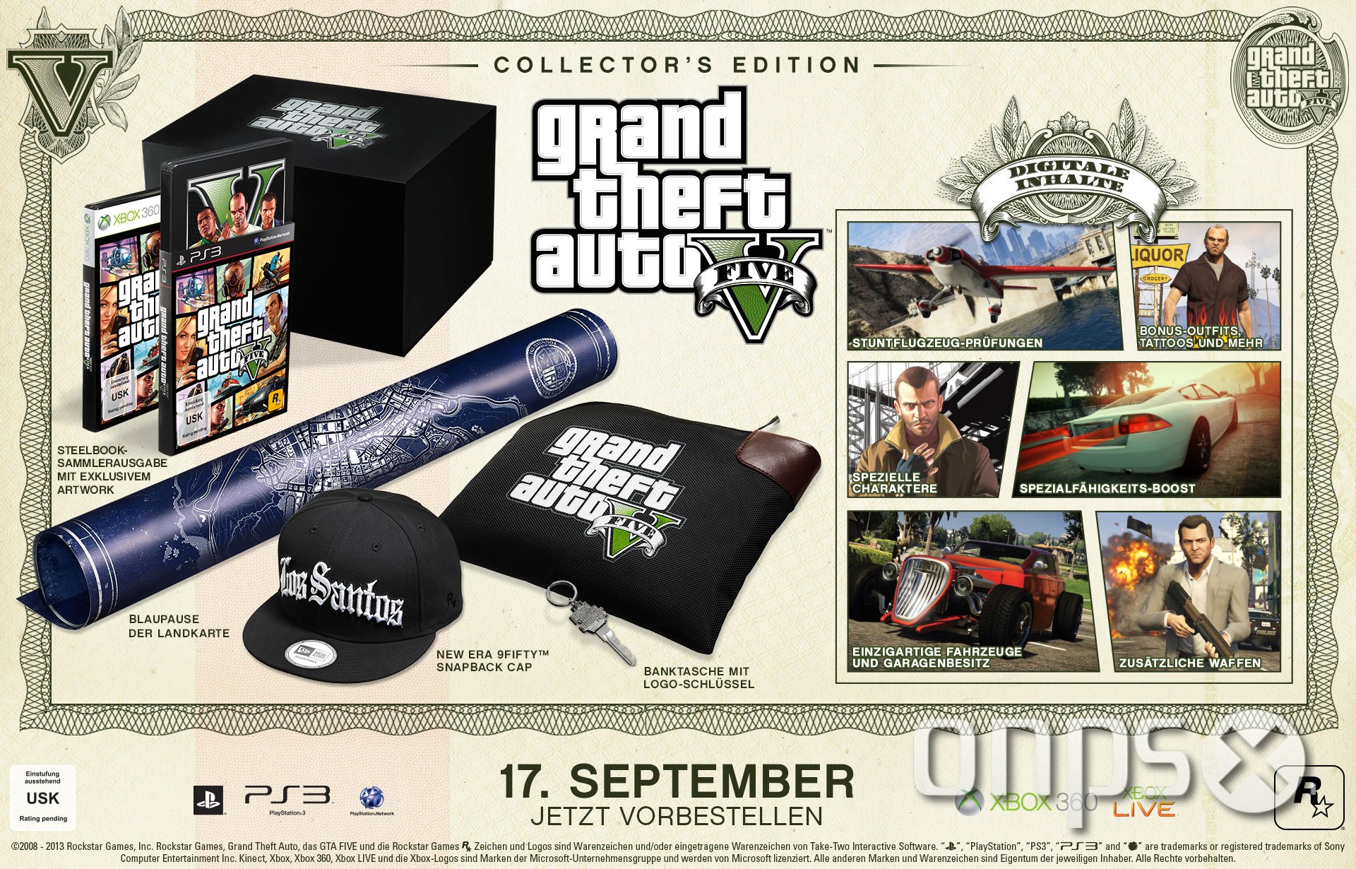 Die Grand Theft Auto V Collector’s Edition und die Grand Theft Auto V Special Edition mit speziellen digitalen Inhalten und exklusiven physischen Gegenständen zu Grand Theft Auto V sind perfekt dazu geeignet, die Rückkehr dieser umjubelten Spielereihe zu feiern. Die Grand Theft Auto V Collector’s Edition wird für 129,99 € (UVP), die Grand Theft Auto V Special Edition für 79,99 € (UVP) erhältlich sein.