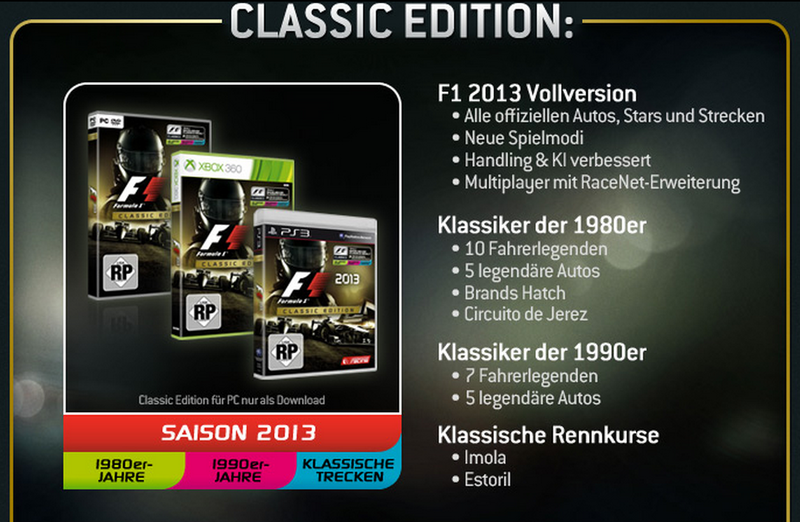 Entwickelt von Codemasters im Rahmen eines exklusiven mehrjährigen Vertrags mit der Formula One World Championship Limited, wird das Spiel weltweit in zwei Edition erscheinen: F1 2013 und F1 2013: CLASSIC EDITION.