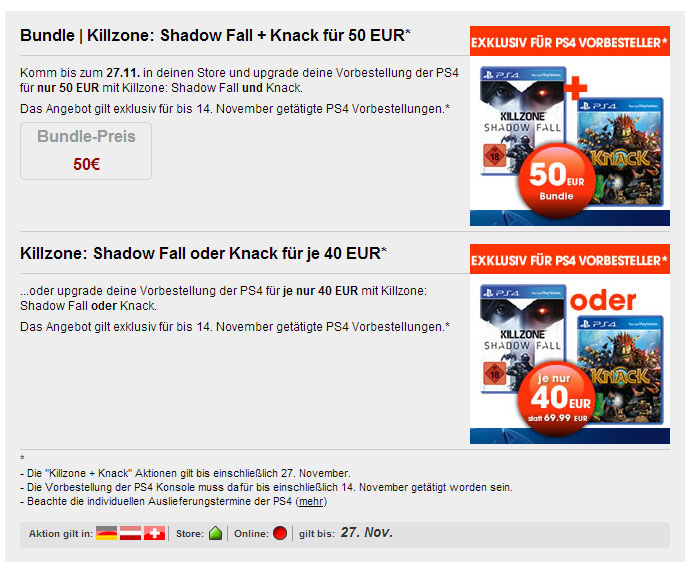 Bis zum 27. November können sich alle Zocker, die sich bei GameStop eine PlayStation 4 vorbestellt haben, ein günstiges Bundle mit Killzone: Shadow Fall und Knack sichern - dazu zahlt man "nur" 50€ Aufpreis zur PS4 Konsole. Andernfalls kann man sich auch jeweils eines der beiden Spiele für 40€ holen.