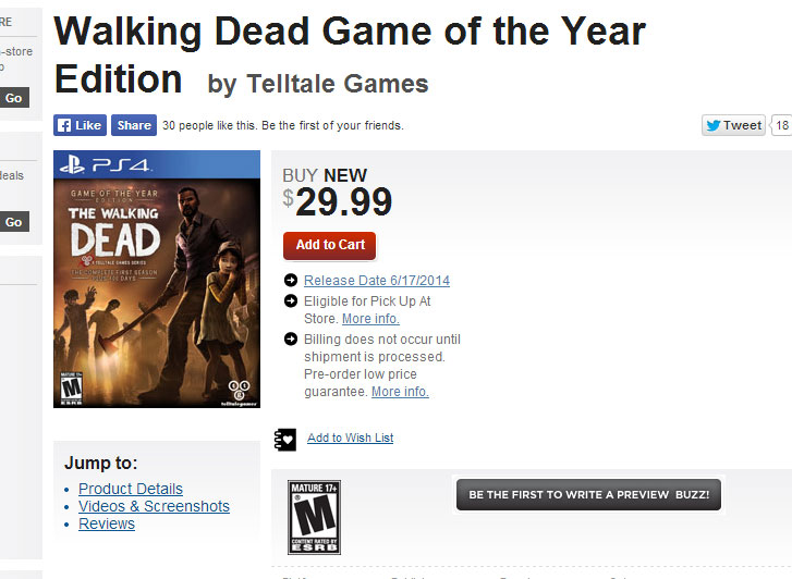 Telltale Games wie The Walking Dead und The Wolf Among Us versprechen kurzweilige und interessante Unterhaltung im Episodenformat. Nur leider sind die PS3 Versionen in technischer Hinsicht mehr schlecht als recht, weswegen Fans schon lange auf PS4 Umsetzungen warten. So wie es aussieht, könnte sich der Wund demnächst erfüllen. Gamestop USA listet für den 17. Juni 2014 die The Walking Dead - Season 01 - Game of the Year Edition auf Blu-ray. Gleichzeitig dürfte die Serie jedoch auch im PSN-Store erscheinen - hoffentlich auch bei uns.