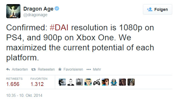 Nach Ubisofts Geschwurbel um die niedrige "900p" Auflösung vom neuen Assassins Creed auf beiden Konsolen, redet EA einmal Klartext und twittert, dass Dragon Age Inquision in 1080p auf der PS4 laufen wird und lediglich - der geringeren Leistungsfähigkeit geschuldet -in 900p auf Xbox One. Damit würde man das Maximalste aus den Konsolen herausholen. Macht auch Sinn, da die PS4 nun mal weitaus mehr Power hat, als die Konkurrenz von Microsoft.