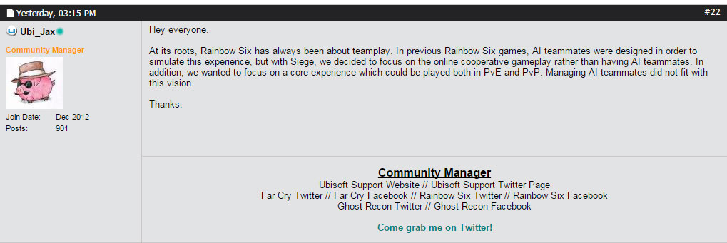 Irgendwie hat man es ja schon vermutet, dass der neue Rainbow Six Titel nichts mit den Vorgängern gemein haben wird. Stattdessen steht Teamplay und Gruppenkampf (Polizei gegen Terroristen) im Vordergrund. Also ein auf Mehrspielergefechte fokusierter Titel. Doch das hält ja bekanntlich nicht davon ab, auch eine Kampagne für Solo-Zocker anzubieten. Anscheinend doch, denn der neue Titel wird bestenfalls nur Missionen für Solo-Kämpfer bieten und das nicht etwa im Team, sondern als Rambo ganz alleine. Ubisoft Montreal konnte sich nicht einmal dazu durchringen, den Schwierigkeitsgrad anzupassen - stattdessen hat man es als "einsamer Wolf" noch schwerer gegen die Gegner. Ach und bevor ich es vergesse, laut den Entwicklern gehört bzw. gehörte das Management eines Teams nie zur DNA der Serie. Na wenn das so ist...