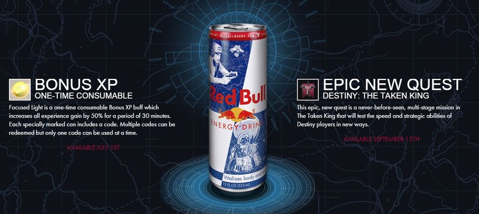 In den USA haben Activision und Red Bull eine Zusammenarbeit vereinbart. Ab dem 01. Juli wird es eine spezielle Destiny Edition des Energy Drinks geben. Wer diesen konsumiert, findet einen Code auf der Unterseite der Deckellasche und bekommt dafür nicht nur 30 Minuten lang doppelte Erfahrungspunkte, sondern kann ab dem 15. September auch ein umfangreiches neues Quest in Destiny: The Taken King abschließen.