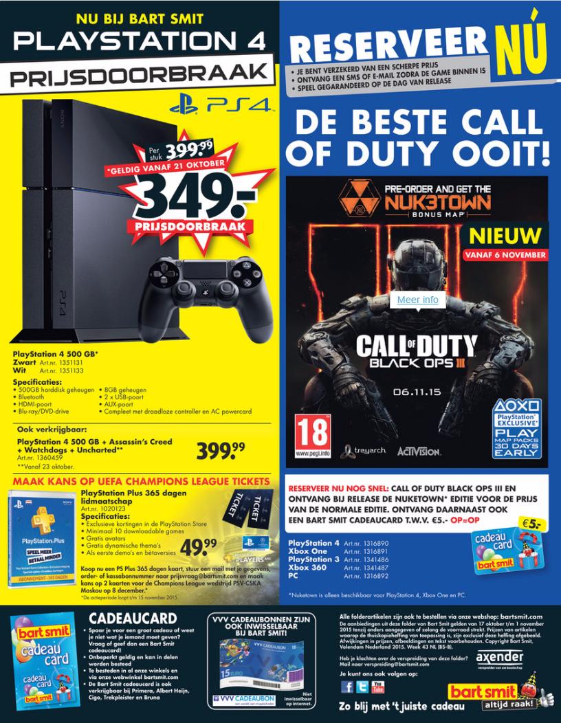 Nord-Amerika und Asien haben sie bereits: Die offizielle Preissenkung der PS4 auf 349,99€ für das 500GB Modell. Europa kommt nun wohl auch am 21. Oktober 2015 dran (also noch vor Sonys Pressekonferenz zur Paris Game Show am 27. Oktober). Niederländische und französische Geschäfte haben bereits Werbematerial erhalten bzw. verteilen Flyer dafür. Für Deutschland sollte das dann auch zu treffen.