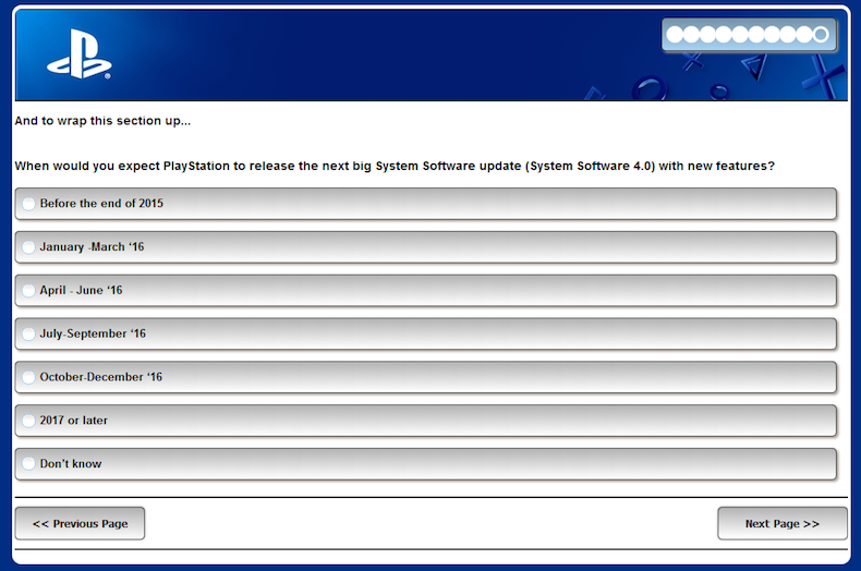 Gerade erst ist Firmware 3.0 für die PlayStation 4 erschienen und im Hintergrund laufen natürlich bereits die Vorbereitungen für die nächsten Updates. Nun hat Sony aber an ein paar ausgewählte Spieler eine Umfrage geschickt, in der man sich Anregungen und Wünsche holen möchte. Meist konnten die Teilnehmer frei ihre Wünsche äußern, doch am Ende gab es auch ein paar Wahlmöglichkeiten mit möglichen Features.