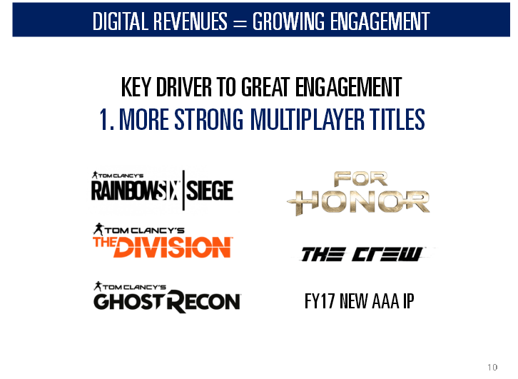 Eine Möglichkeit seine Umsätze und Gewinne zu steigern sieht Ubisoft darin seinen Fokus auf mehr Multiplayer-Titel zu legen. Darunter fallen Spiele wie The Division, Rainbow Six Siege oder auch For Honor. Zu diesen soll sich aber auch noch eine neue AAA Ip gesellen, die im Fiskaljahr 2017 erscheinen soll. Das Fiskaljahr endet immer im März, sodass wir vor März 2017 mit einem Release rechnen dürfen. Möglicherweise wird es schon dieses Jahr auf der E3 eine Ankündigung geben.