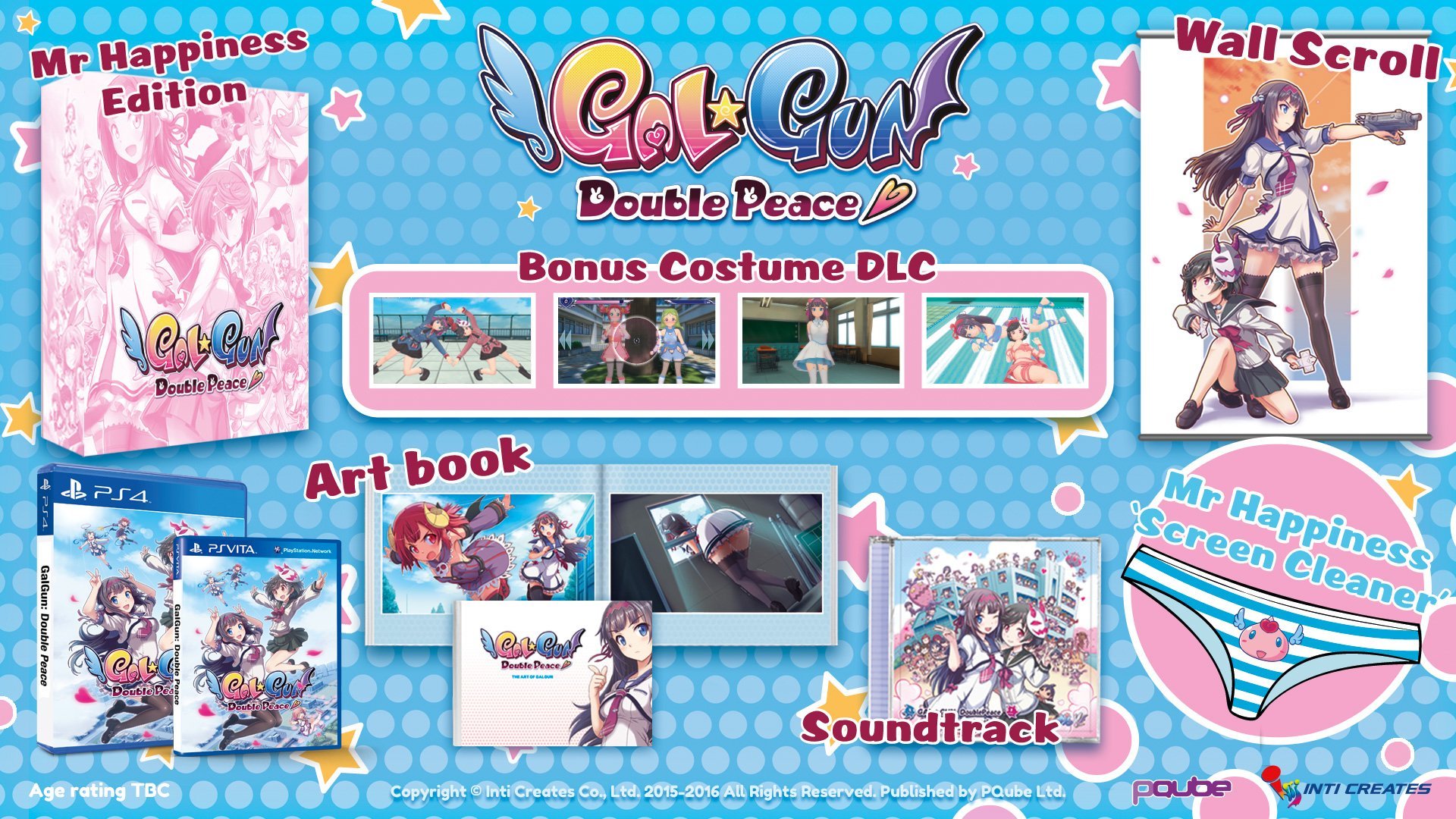 Der.... *ähem* aussergewöhnliche Shooter Gal Gun: Double Peace erscheint im Sommer in Europa für Vita & PS4. Passend dazu wird es eine *nette* Special Edition geben. Die "Mr. Happiness" Edition beinhaltet ein Art Book, 4 DLC Kostüme (Cunning Kunoichi, Wedding Dress, Sexy Ribbons und Sakurazaki Squad 777), ein Shinobu und Maya Wall Scroll, den Soundtrack und... einen Schlüpfer - okay, das ist nur ein Putztuch, zum Reinigen von Bildschirmen...aber in Schlüpferform!