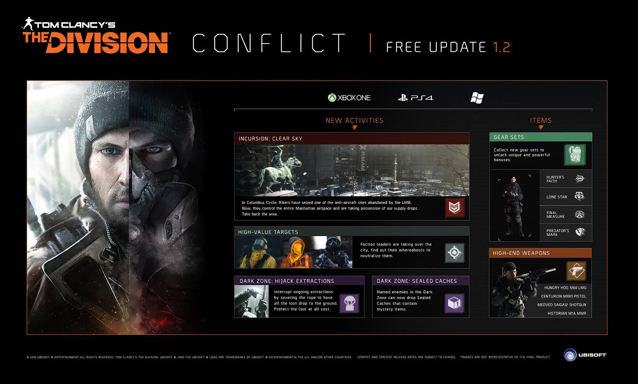 Ubisoft gab heute bekannt, dass das zweite kostenlose Update Konflikt für Tom Clancy’s The Division am 24. Mai erscheint. Mit dem Update wird eine Reihe neuer Aktivitäten freigeschaltet. Darunter ein neuer Übergriff: Klarer Himmel und sogenannte hochrangige Ziele. Außerdem gibt es neue Set-Gegenstände und Highend-Waffen zu finden.
