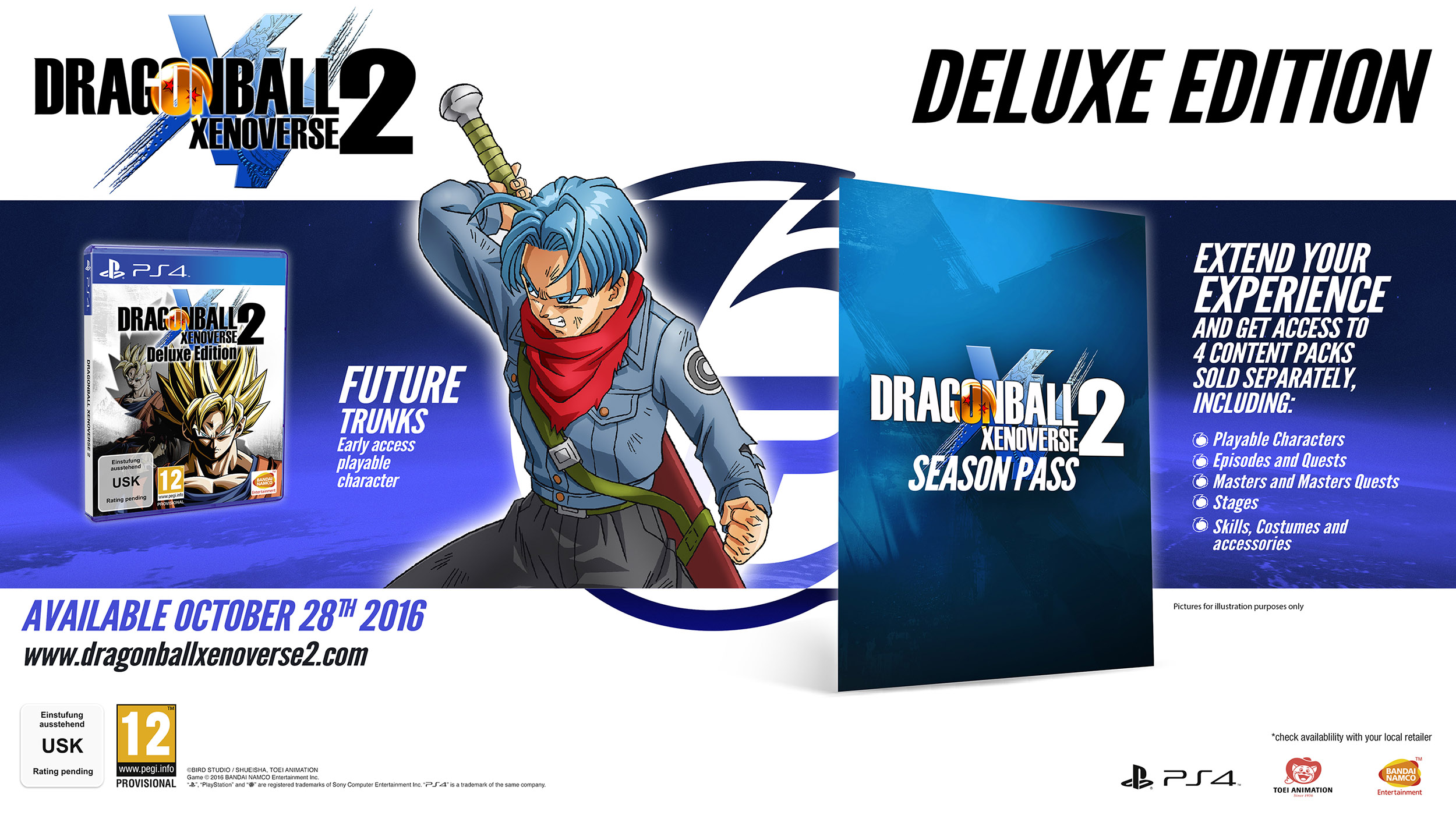 Entscheidet man sich für die Deluxe Edition gibt es natürlich die Vorbestellerboni, aber auch noch den Season Pass oben drauf. Damit bekommt man Zugriff auf vier große Erweiterungen, die weitere Charaktere, Episoden, Quests, Arenen, Skills, Kostüme und Accessoires mit sich bringen. Zudem bekommt man früher Zugriff auf Future Trunks. Natürlich kann man die DLCs oder den Season Pass aber auch alle einzeln kaufen.