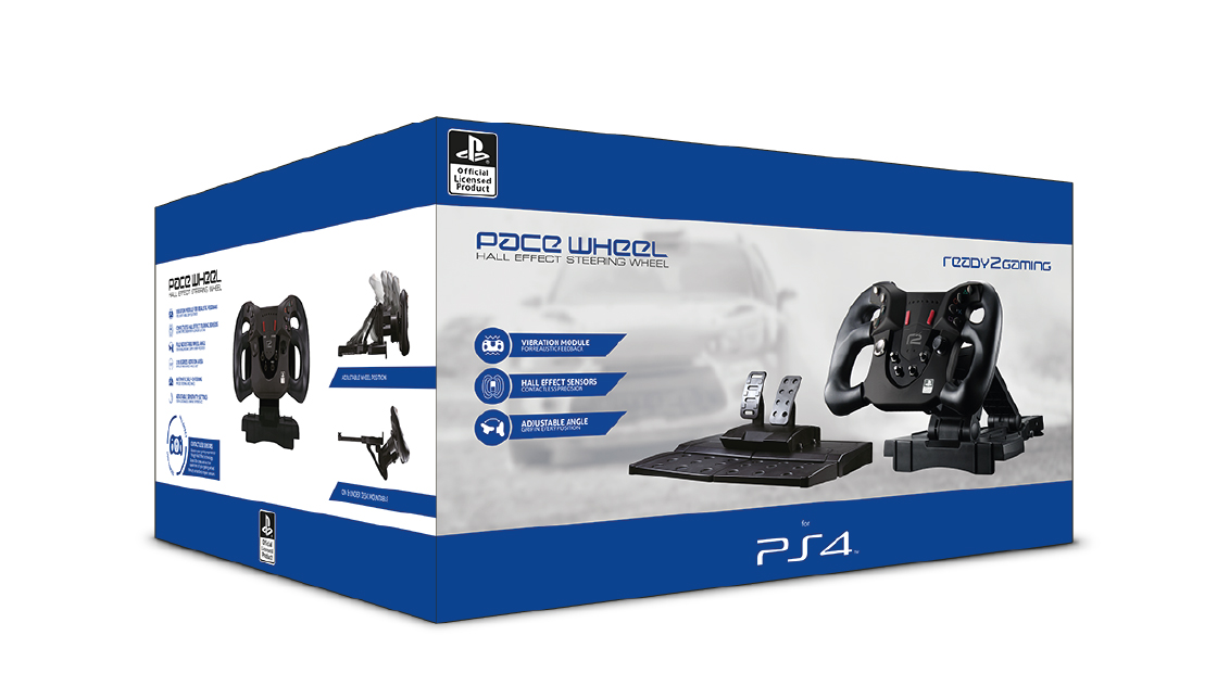Das PS4 Pace Wheel Lenkrad der Marke ready2gaming glänzt mit spielerischem Komfort und hervorragender Verarbeitung. Durch die automatische Selbstzentrierungsfunktion richtet sich das 270° drehbare Lenkrad immer wieder mittig aus, sodass es dem Spieler ein präzises Lenken ermöglicht. Das ready2gaming PS4 Pace Wheel ist mit der Hall Sensor Technologie ausgestattet, welches höchstmögliche Lenkpräzession gewährleistet und Abnutzungserscheinungen der üblichen Lenkräder ausschließt. Hierfür wurde das Lenkrad mit dem Best Choice Award (für Design und Innovation) bei der Computex in Taipei, Taiwan ausgezeichnet. Für ein sicheres Spielerlebnis sorgen die rutschfesten Saugnäpfe und Tisch-Klemmen sowie die hochwertige Gummibeschichtung des Lenkrades. Das faltbare Pedalset, bestehend aus Gas- und Bremspedal, hält selbst stärkster Beanspruchung stand und bietet die nötige Präzision, um in Rennspielen Höchstleistungen zu erzielen.