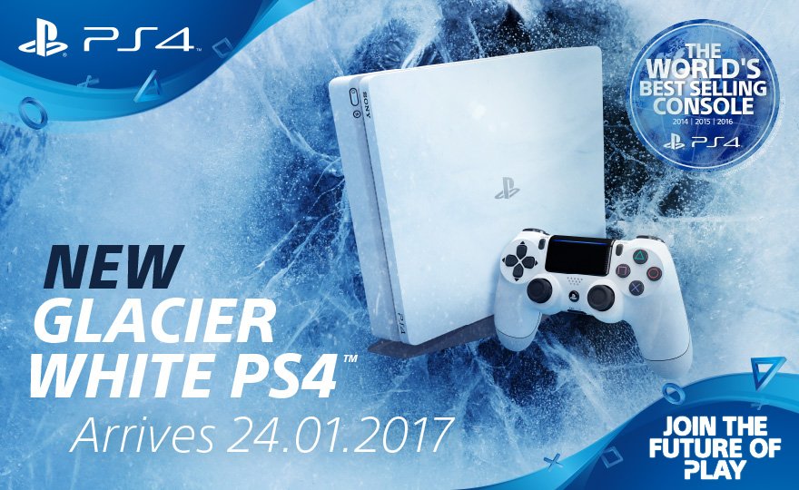 Ab 24.1.2017 wird die PlayStation 4 Slim auch in weiß erhältlich sein. Dieses Modell verfügt dann über eine 500GB HDD und einen weißen DS4 Controller.