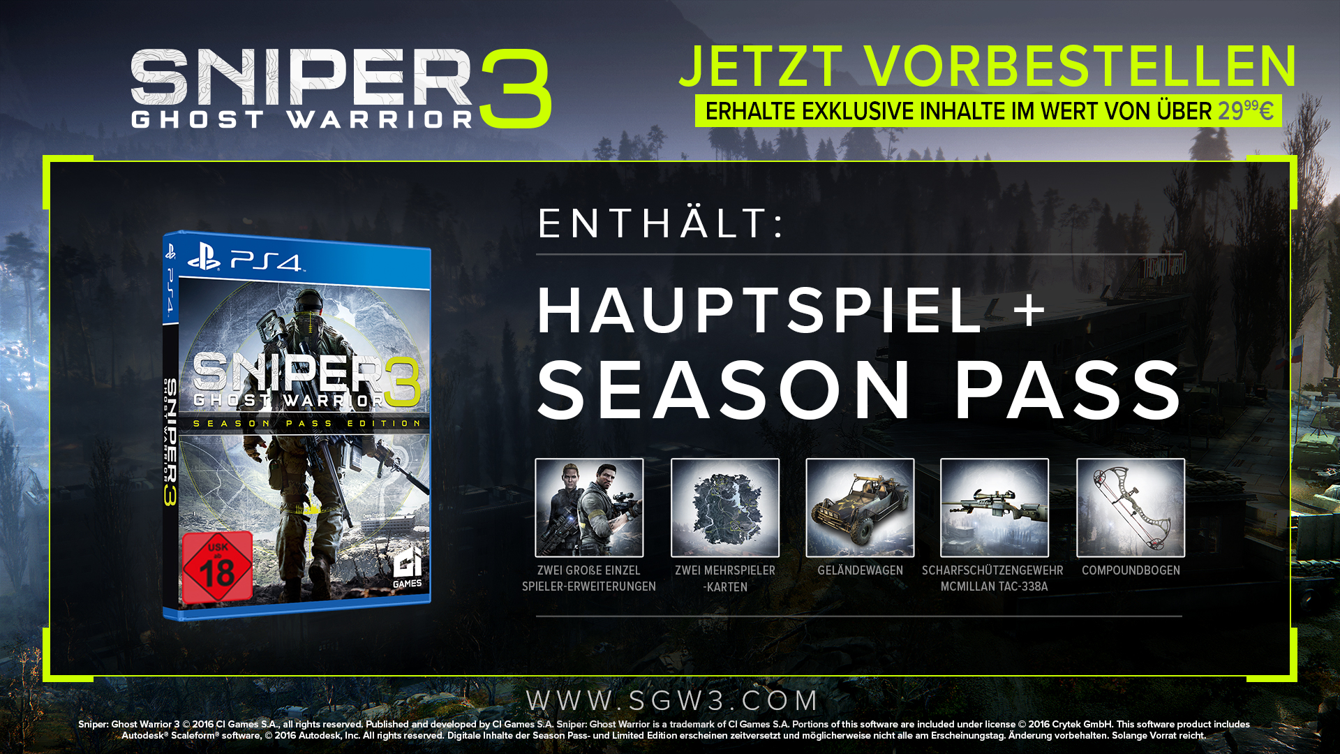 CI Games gibt heute bekannt, dass Vorbesteller von Sniper: Ghost Warrior 3 in den Genuss exklusiver Boni gelangen und weitere Extras ohne zusätzliche Kosten erhalten! Sprich man bekommt den Season pass im Wert von 29,99€ geschenkt!