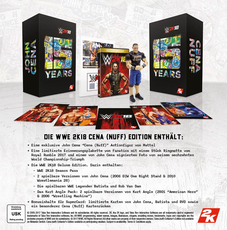 2K gab heute Pläne für die Cena (Nuff) Edition von WWE 2K18 bekannt. Die digitalen Inhalte dieser Edition werden durch eine beeindruckende Sammlung exklusiver Erinnerungsstücke zur Feier der 15-jährigen Karriere des WWE-Superstars John Cena bereichert – eine Hommage an seinen Ruf als am meisten bejubelte und ausgebuhte Persönlichkeit der WWE. Die weltweit auf 30.000 Exemplare limitierte WWE 2K18 Cena (Nuff) Edition wird zum Preis von 149,95€ exklusiv bei Amazon und GameStop für die PS4 One erhältlich sein.