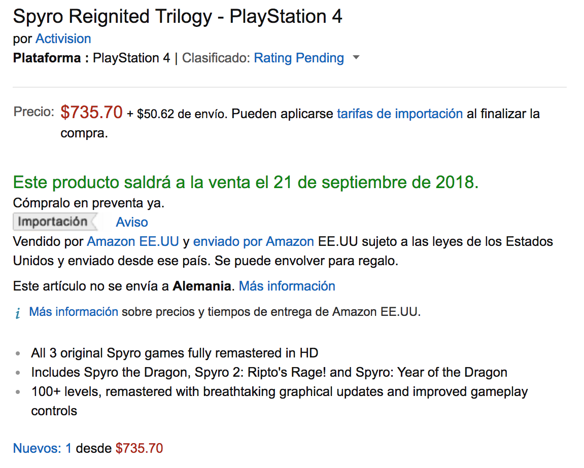 Ups, da hat der Praktikant bei Amazon den Knopf wohl zu früh gedrückt. Denn nun wird dort die Spyro: Reignited Trilogy gelistet. Es soll 40 Euro kosten, am 21. September erscheinen und das Boxart haben wir auch schon für euch. Entwickelt wird das Ganze von Toys for Bob, die zum Beispiel für die Skylanders Spiele verantwortlich waren.