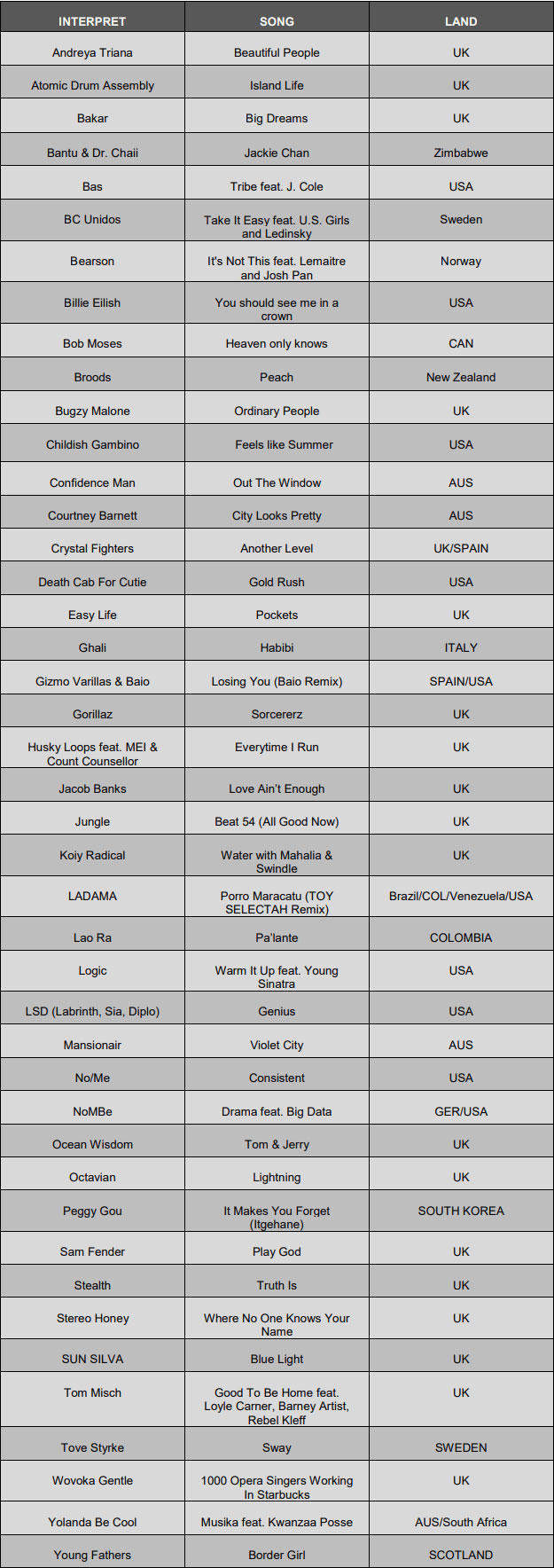 - Songs von Durchstartern, wie Billie Eilish, Rapper Bugzy Malone, Soulsänger Stealth, Octavian, dem norwegischen DJ Bearson, Bas feat. J. Cole und Singer und Songwriter Sam Fender.