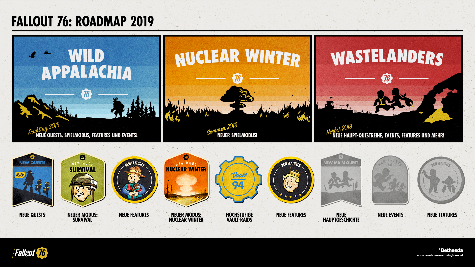 Die erste Roadmap gibt einen Jahresüberblick und beschreibt die drei umfangreichen Content-Updates, die neue Spielmodi, Quests, Geschichten, Events und mehr in 2019 nach Appalachia bringen. Die zweite Roadmap befasst sich konkret mit dem ersten Update, Wild Appalachia, das am 12. März veröffentlicht wird.