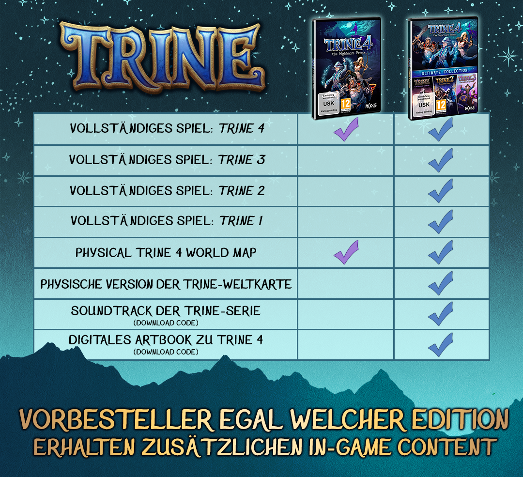 Zusammen mit dem vierten Teil der Serie veröffentlichen Modus Games die Trine: Ultimate Collection. Die mit reichlich Bonus Material ausgestattete Sammlung enthält die Trine: Enchanted Edition, Trine 2: Complete Story, Trine 3: The Artifacts of Power und Trine 4: The Nightmare Prince und erscheint ebenfalls für die PS4.