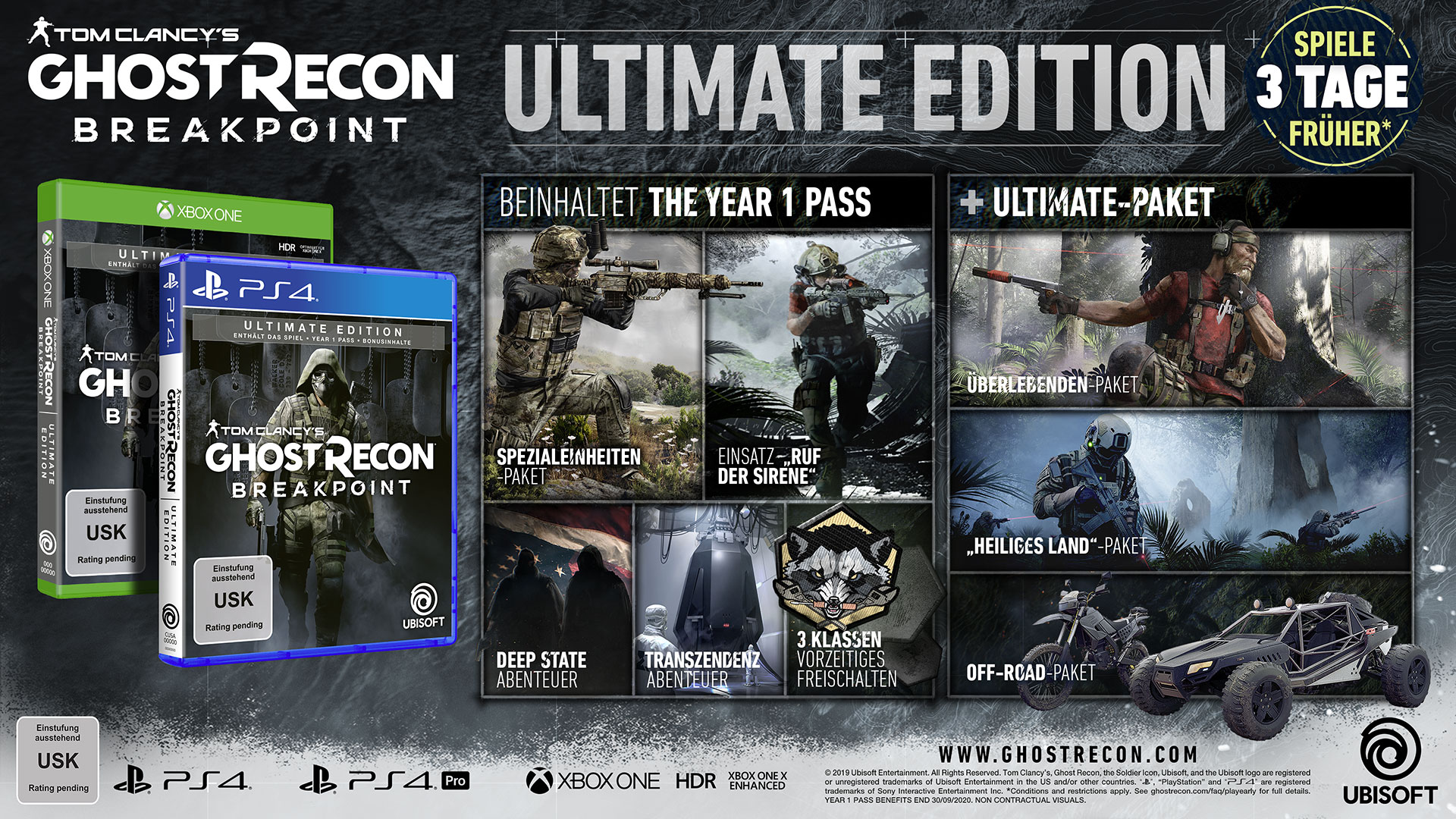 Käufer der Gold, Ultimate oder Collector’s Edition erhalten bis zu drei Tage früher Zugang zum Spiel. Fans, die Tom Clancy's Ghost Recon Breakpoint vorbestellen, erhalten Zugang zur Ghost Recon Breakpoint Beta kurz vor dem Start sowie zum Sentinel Corp. Paket, das exklusive Ausrüstung enthält.