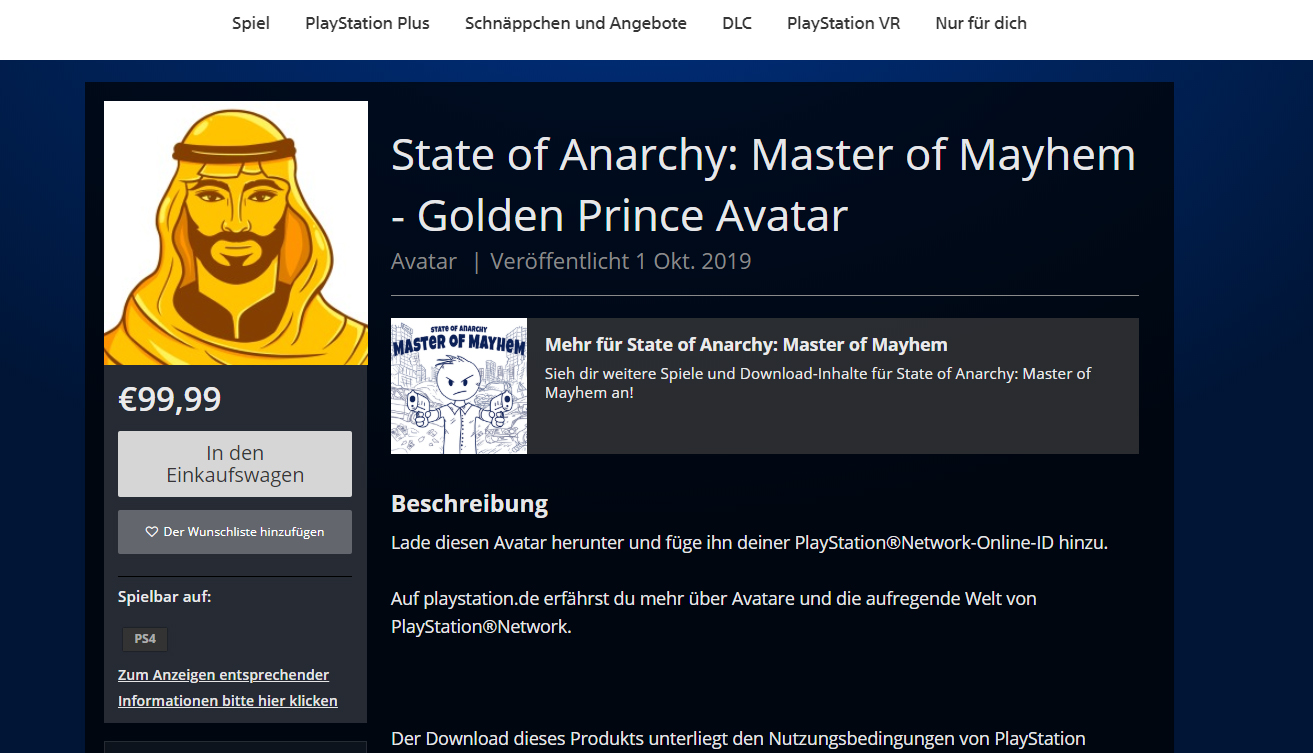 Der State of Anarchy: Master of Mayhem - Golden Prince Avatar basiert auf einem Indie-Spiel namens State of Anarchy: Master of Mayhem und ja, kostet halt gleich mal 100 Euronen. Ob das gewollt oder ein Preisfehler ist, wird sich zeigen - zumindest sollte Sony etwas mehr Sorgfalt beim Pflegen des PSN-Stores walten lassen und nicht nur die Flut von billig gemachten Avataren und Themes eindämmen, sondern vielleicht auch zeitgemäße Features einführen, wie ein 14-tägiges Rückgaberecht auf digitale Einkäufe!