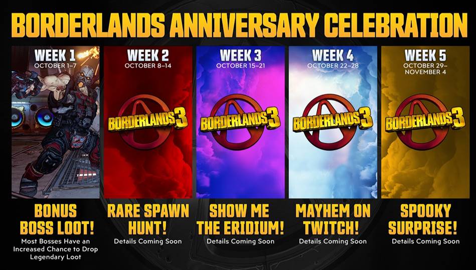 Vergiss nicht, das ist nur der Anfang der Borderlands-Jubiläumsfeier. Wir sparen uns einige Überraschungen für später auf, aber hier ist schon mal ein Einblick in den Motto-Kalender: