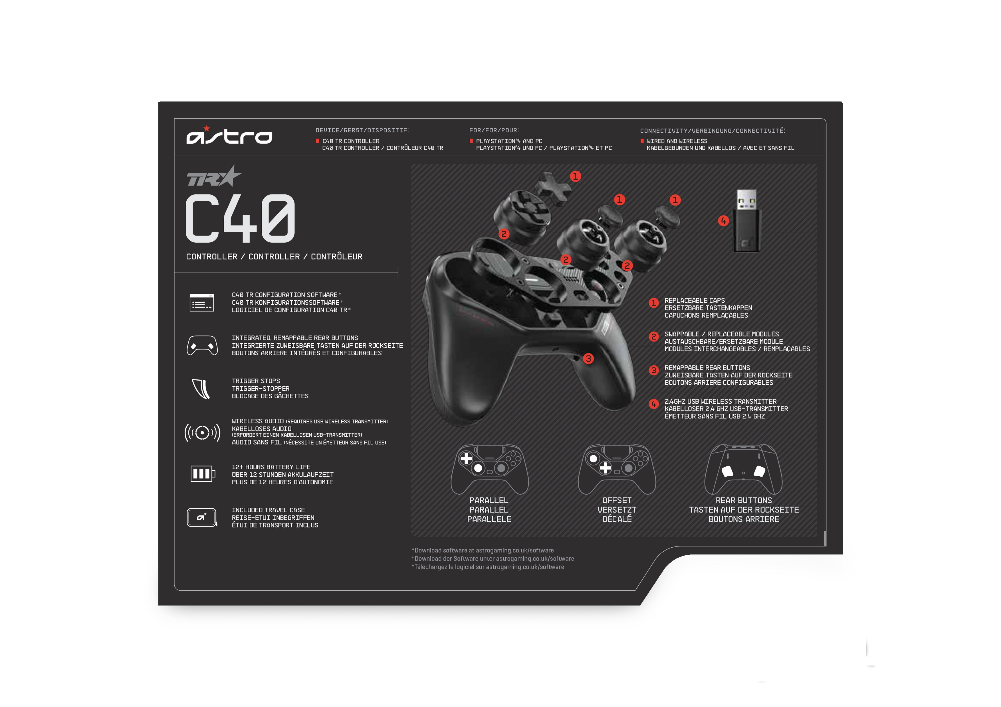 - Die Astro Konfigurations-Software erhöht die Vielseitigkeit und Genauigkeit des C40 TR um ein Vielfaches. Profile lassen sich ganz einfach erstellen und direkt am Controller wechseln. Die Software erlaubt es, die Empfindlichkeit der Trigger-Tasten und Sticks zu ändern sowie Einstellungen am Equalizer, Audio- und Mikroausgang sowie Nebengeräuschen vorzunehmen.