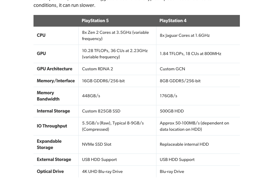 Nun sind sie raus - die PlayStation 5 Hardware Spezifikationen. Neben einem 8x Zen 2 mit 3,5 Ghz besitzt die PS5 einen speziellen RDNA 2 Grafikchip, 16GB GDDR6 RAM, eine eingebaute 835GB SSD Festplatte, Support für NVMe SSD Platten und externe USB HDDs und ein 4K UHD Blu-ray Laufwerk. Den Rest entnehmt ihr dem Bild.