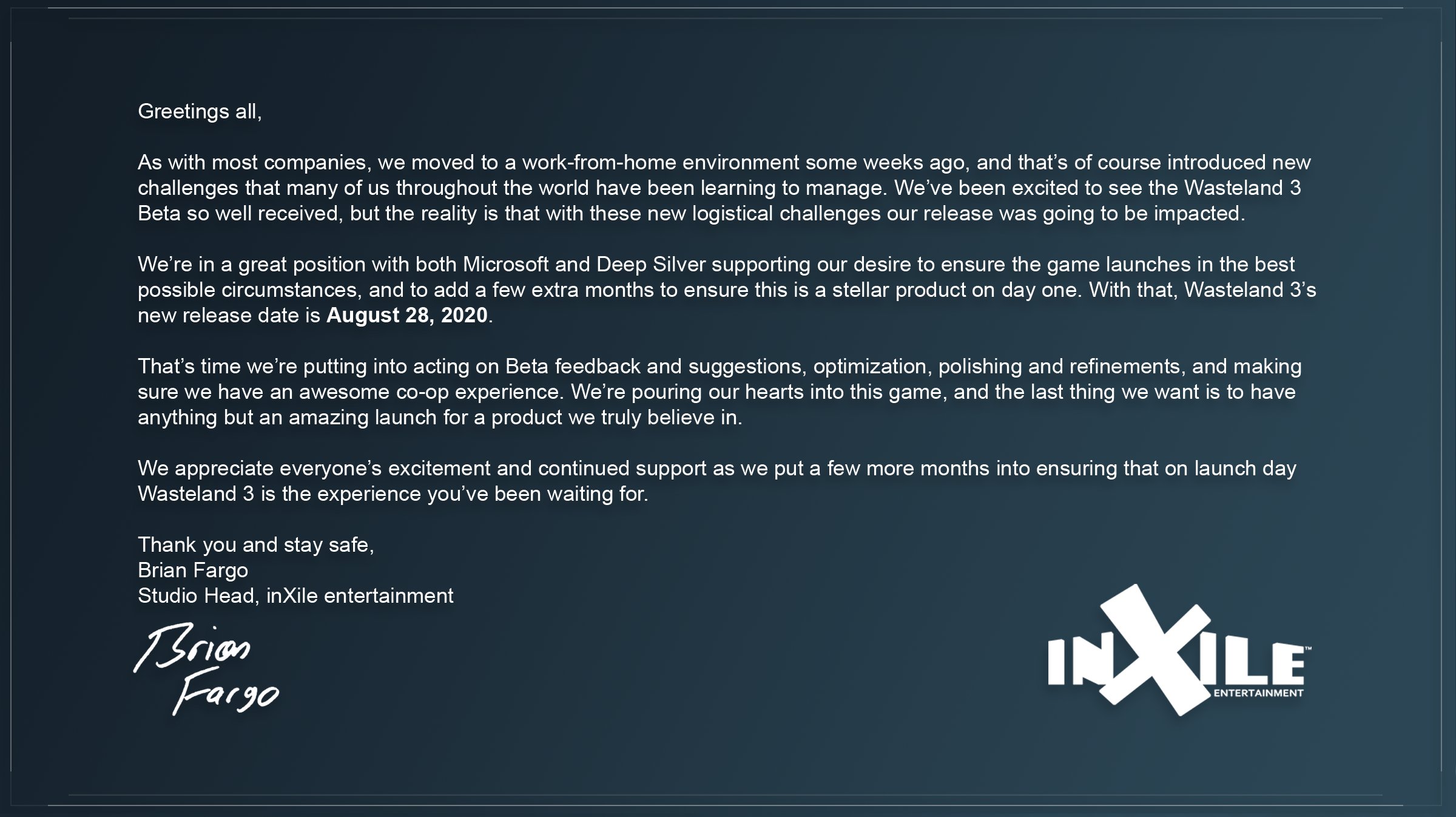 Ursprünglich sollte das dritte Wastelands Spiel im Mai diesen Jahres erscheinen, doch durch die Coronavirus-Pandemie und dem darauf folgenden "Work at Home" bei den inXile Studios wird es auch hier Einschränkungen und weitere Herausforderungen geben. So das man in Absprache mit Eigentümer Microsoft und Publisher Deep Silver den Releasetermin auf den 18. August 2020 verschoben hat. Die zusätzliche Zeit will man auch nutzen, um dem Spiel nochmal eine Extraschicht Politur mitzugeben.