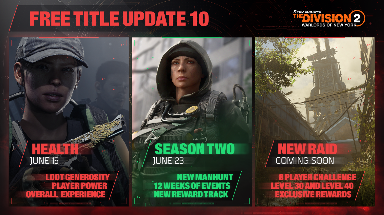 Ubisoft gab heute bekannt, dass das "Titel Update 10" für Tom Clancy‘s The Division 2 am 16. Juni erscheint und viele Verbesserungen und Fixes mit sich bringt. Am 23. Juni startet zudem Season 2 von Die Warlords von New York, die den Spielern aufregende und neue Endgame-Inhalte bietet. Kurz nach Veröffentlichung von Season 2 wird mit dem zweiten Raid die ultimative Herausforderung für alle Spieler zurückkehren.