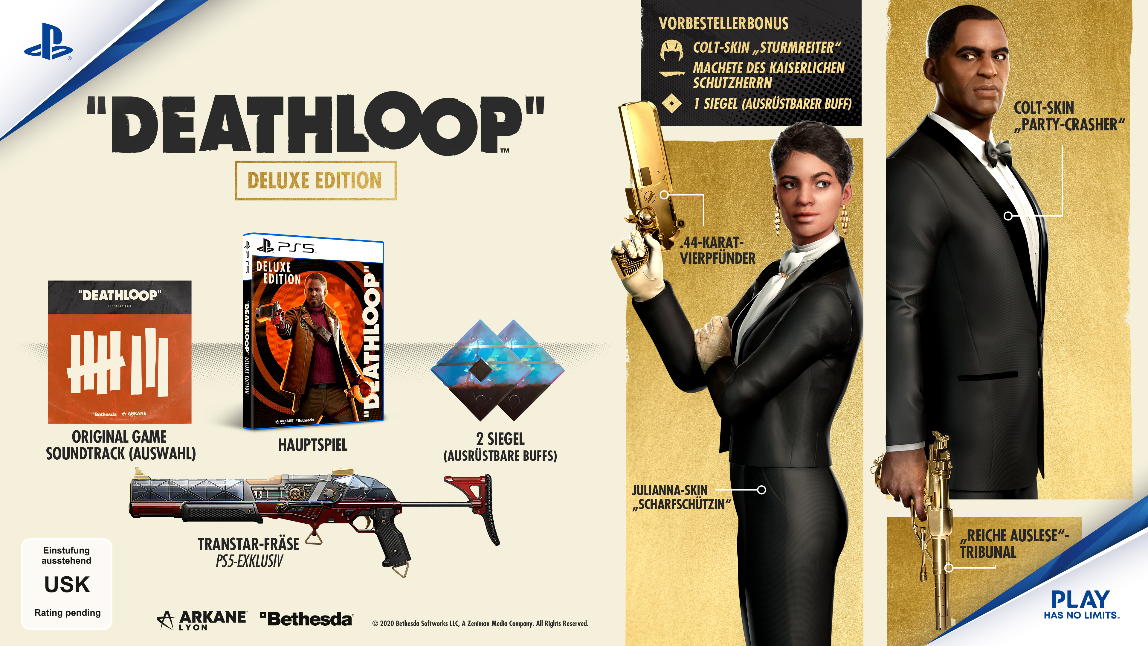 Deathloop, der innovative First-Person-Shooter von Arkane Lyon, erscheint am 21. Mai 2021 bei Launch konsolenexklusiv auf der PlayStation 5. Ab sofort können die Deathloop Standard Edition für 69,99€ und die Deathloop Deluxe Edition für 89,99€ im PlayStation Store vorbestellt werden. Diese Versionen enthalten die folgenden Ingame-Boni: