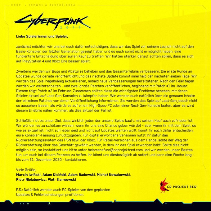 Digital Foundry hat hierzu einen interessanten Bericht veröffentlich und auch diverse Spiele-Medien korrigieren bereits ihre Spiele Wertungen zur normalen PS4 Version hinunter. Besitzer einer PS4 Pro und PS5 kämpfen glücklicherweise nicht mit Performance Problemen, aber mit zahlreichen Bugs. Mittlerweile hat auch CD Projekt RED erkannt, dass man hier keine saubere Arbeit abgeliefert hat und bieten den PS4 Besitzer die Möglichkeit das Spiel zurückzugeben.