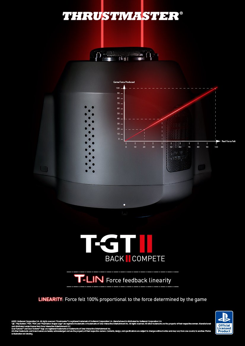 Das T-GT II ist mit Thrustmasters bewährtem bürstenlosen Motor T-40VE ausgestattet, der ein hochpräzises Force Feedback und ein gleichmäßiges Drehmoment während der Rennen liefert. Außerdem verfügt das T-GT II über das beliebte Force-Feedback-System T-DFB (Depth FeedBack / Tiefen-FeedBack) das bereits bei seinem Vorgänger zum Einsatz kam. Diese ausgeprägte Tiefenwahrnehmung auf der Force-Feedback-Achse liefert Präzisionsdaten zwischen 30 Hz und 100 Hz und vermeidet den Informationsverlust, der bei herkömmlichen Force-Feedback-Systemen auftritt.